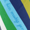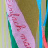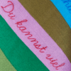 Design:Gestreift in Rosa, Senfgelb, Hellblau und Grün mit gestickter Schrift